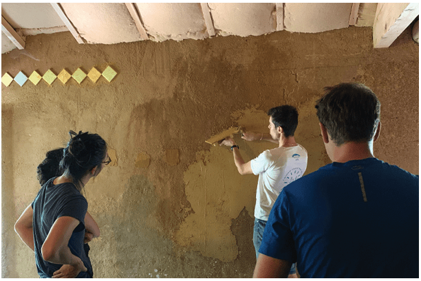 Un stage est organisé pour transmettre des enseignements aux participants. L’objectif consiste à partager un ensemble des connaissances dans un temps donné. L’équipe organisatrice se concentre sur la transmission des connaissances et, si les participants comprennent vite et bien le chantier école peut avancer un peu plus que prévu. Le chantier n’avance pas comme il avancerait sans le volet pédagogique. Il sera certainement repris ensuite pour corriger les erreurs. L’équipe d’animation est concentrée à transmettre et n’est donc pas en situation réelle de chantier. Les participants profitent malgré tout d’une situation de chantier pour visualiser les espaces, les différentes tâches, les outils, leur usage, et ils peuvent ainsi pratiquer. Mais le chantier fonctionne au ralenti et malgré l’application des stagiaires, il ne sera correctement réalisé.