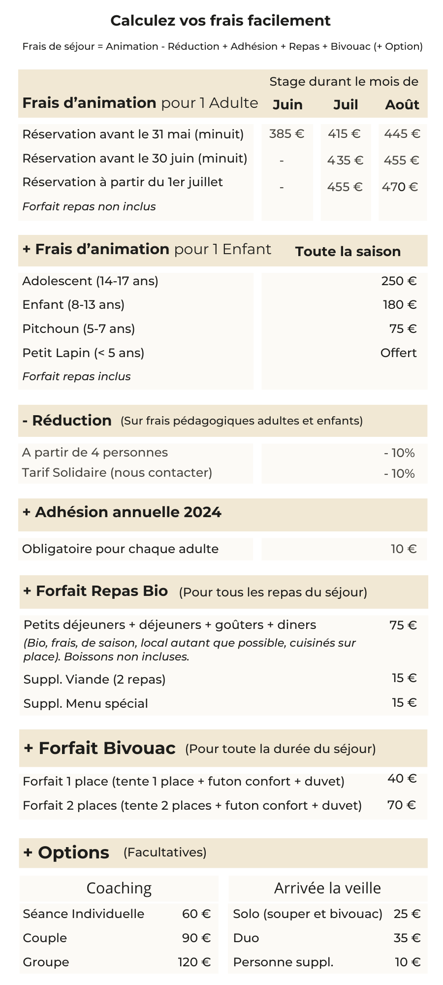 1. Nos tarifs sont très corrects au regard de la qualité des stages que nous proposons