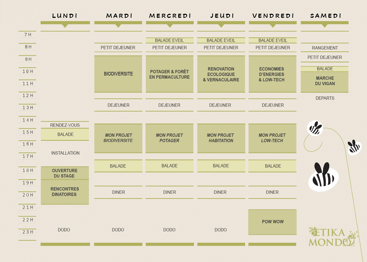 Nous vous conseillons de profiter directement des stages Immersion Nature et Ecolieu qui sont très complets. Toutefois, nous pouvons organiser un stage sur mesure et pour une période plus courte, conscients des contraintes de l’entreprise. Nous pouvons également nous déplacer préalablement pour préparer l’immersion avec vos équipes. Contactez-nous sur dringdring@etikamondo.com.